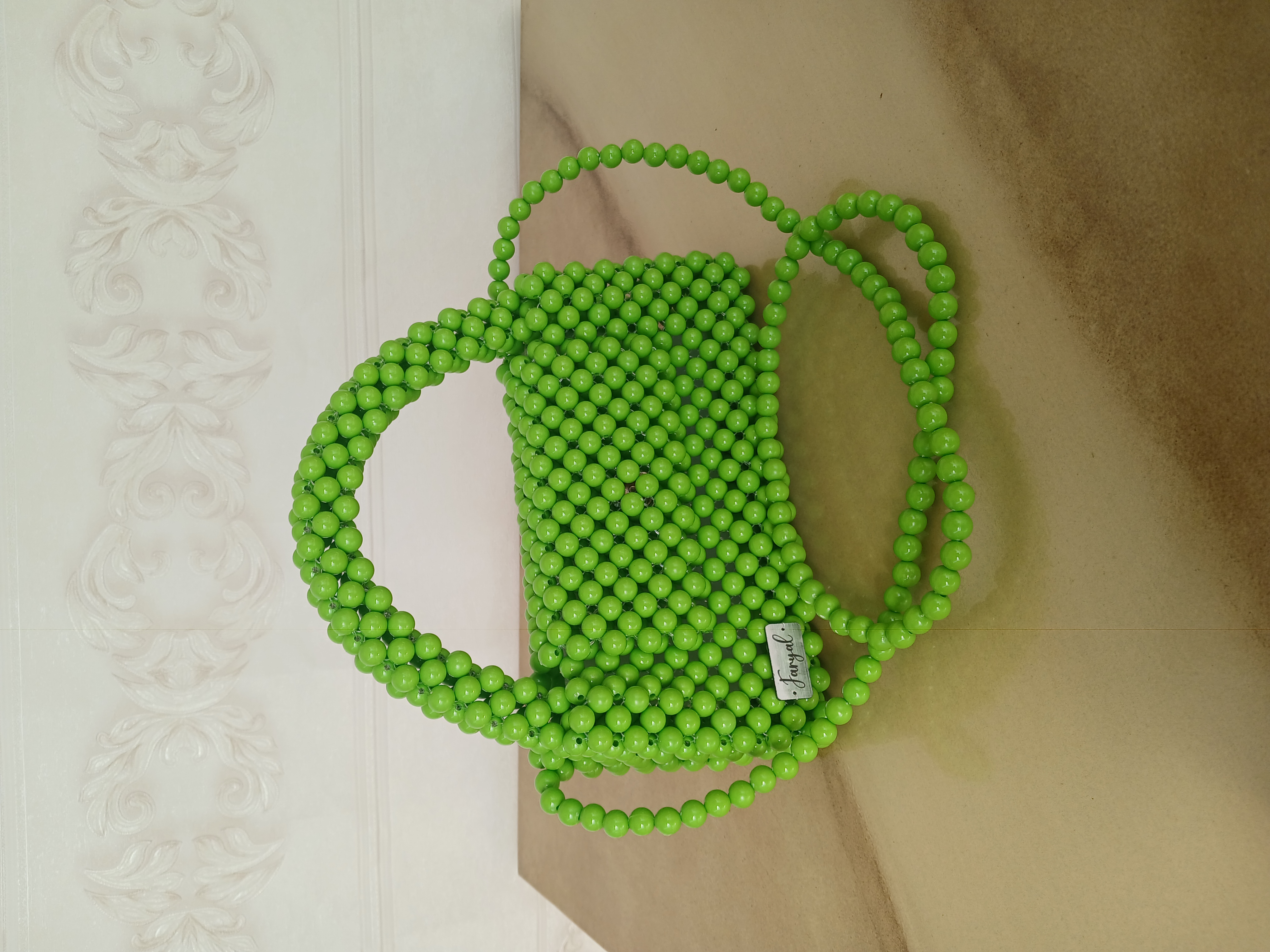 کیف مرواریدی_پلیمری زیبامون با ابعاد ۲۱ در ۱۲ و وزن حدودا ۵۰۰ گرم با ایستایی عالی مناسب برلی نگهداری موبایل و اشیا در حد موبایل و کوچکتر بدون آستری و ساخته شده از مروارید های پلیمری سبز