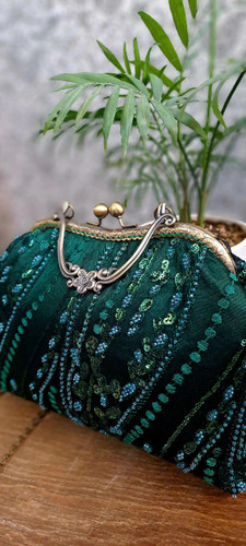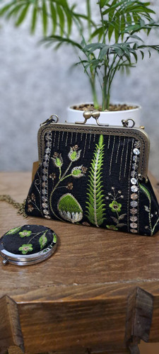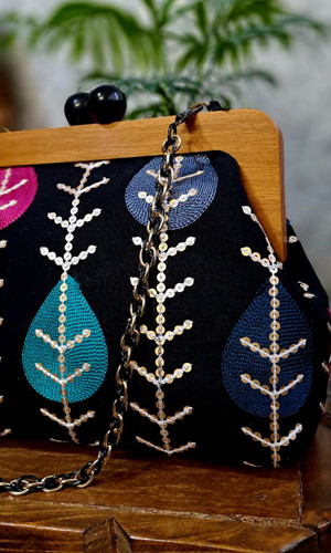 کیف پارچه ایی سوزن دوزی و پولک دوزی شده دهانه چوبی v9